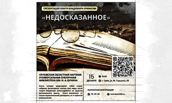 В Орловской библиотеке имени И.А. Бунина пройдёт презентация книги Владимира Ермакова «Недосказанное». Сборник философских размышлений вышел в свет после кончины автора благодаря региональному гранту, инициативе ассоциации «Общественный союз Орловской области», а также участию директора Музея-заповедника «Спасское- Лутовиново» Сергея Ступина. Презентация состоится 15 декабря в 15:00, вход ...